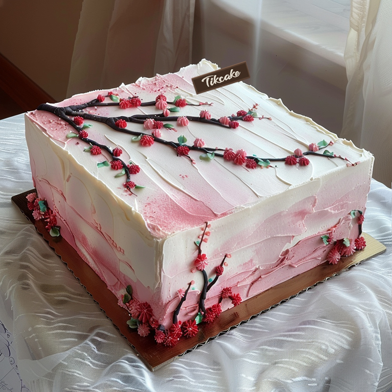 原创中国风红梅主题方形鲜奶蛋糕
