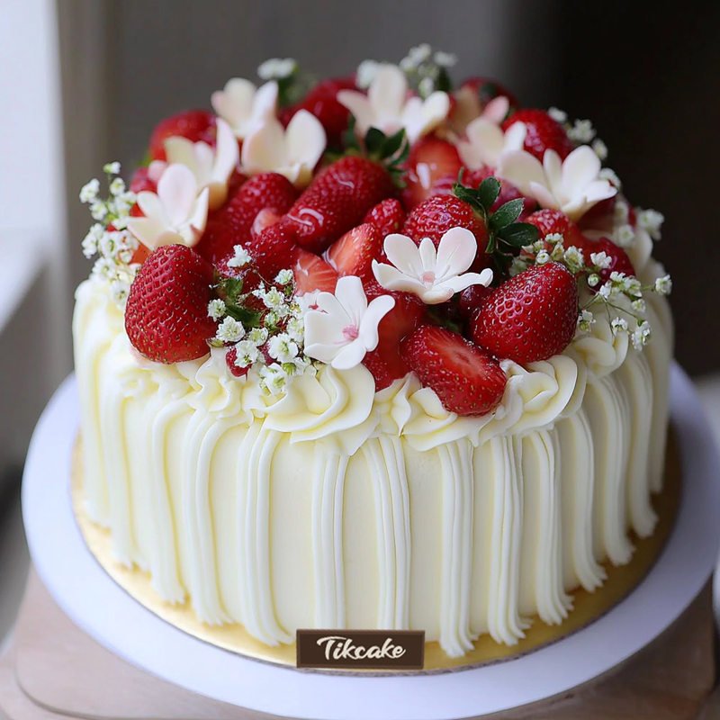 内层蛋糕胚 奶油(含水果果肉)叠加,表层奶油、草莓等装饰