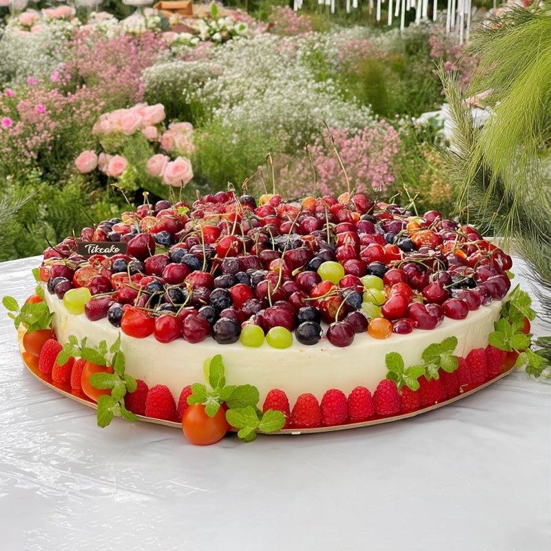 内层蛋糕胚 奶油(含水果果肉)叠加,表层奶油、水果等装饰